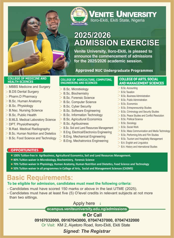 Venite University, Iloro-Ekiti, has officially opened its admission portal for the 2025/2026 academic session, calling on qualified candidates across Nigeria to apply for undergraduate programmes through UTME and Direct Entry.
